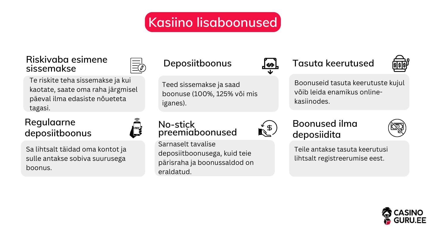 Kasiino boonuseid on saadaval üha rohkem ja rohkem, kuid peamised neist on hetkel järgmised: kleepuv või mitte-kleepuv sissemakse boonus koos kordusnõuetega, tasuta keerutuste boonus, riskivaba sissemakse, kordusnõueteta boonus, deposiidita kasiino boonus.
